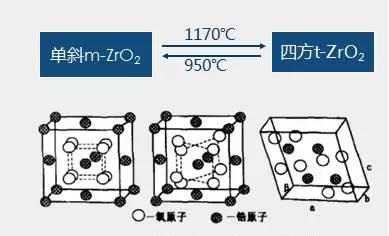 ZrO2四方相與單斜相之間的轉變是馬氏體相變,由于四方相轉變?yōu)閱涡毕鄷r有 3~5%的體積膨脹和 7~8%的切應變。因此,純 ZrO2 制品往往在生產(chǎn)過程(從高溫到室溫的冷卻過程)中會發(fā)生 t-ZrO2 轉變?yōu)?m-ZrO2 的相變并伴隨著體積變化而產(chǎn)生裂紋,甚至碎裂,因此無多大的工程價值。