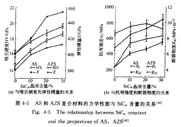將兩種粉料分別配成分散良好的懸浮液,將兩種分散液混合,用瑪瑙球在QGM3-1輕型罐磨機聚氨酯磨罐中濕磨22h。混好的漿料用無水乙醇清洗3遍,然后在氮氣氣氛中0.93MPa下熱壓燒結,1650℃中保溫半小時?。周玉等人的制備工藝與之相似,試樣有AS和AZS材料,AZS材料中含有20%(體積分數)2Y-ZrO2,AS材料中隨SiC含量從0增加到30%(體積分數)[4圖4-5表明,AS材料的抗彎強度隨SiCw含量的增加而不斷提高,而且最初加入的10%(體積分數)SiC、強化效果最為顯著而后增長緩慢慢。